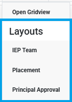 Below the main "Open Gridview" button is a menu of Layouts. These are pre-made views created by an administrator or a staff member to help with specific tasks.
