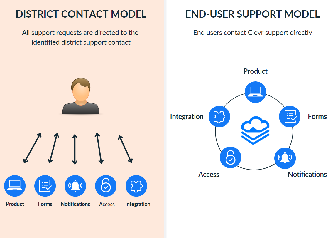 District Support Contact will contact Clevr Support for all Product / Integration issues | Clevr Support Desk is the First Point of Contact for End Users