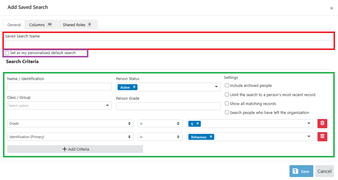 - Saved Search Name: Give your search a clear, recognizable name, such as "Grade 5 Behaviour".