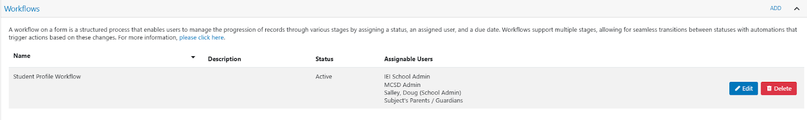 If you want to define the movement between the various states of the workflow return to Form Management, click on the form with the Workflow, find the appropriate Workflow that you want to set up the Transitions for and hit Edit on the right.
