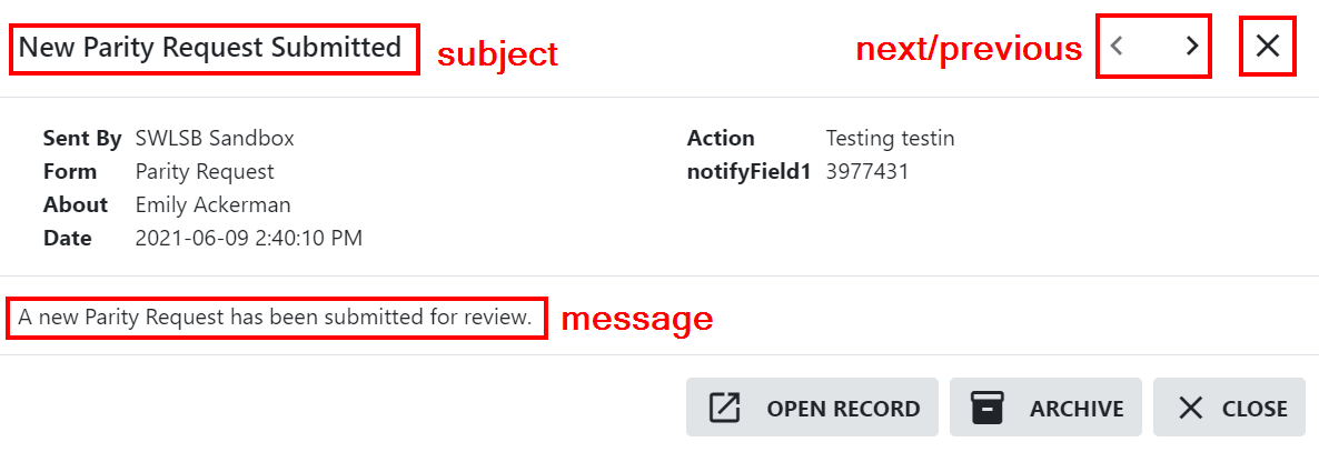 Open Record | Clicking this button will take you to the record the notification was sent from |