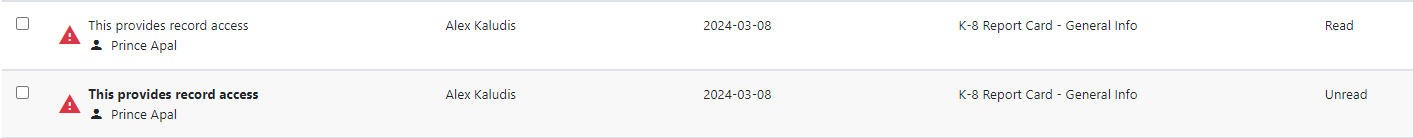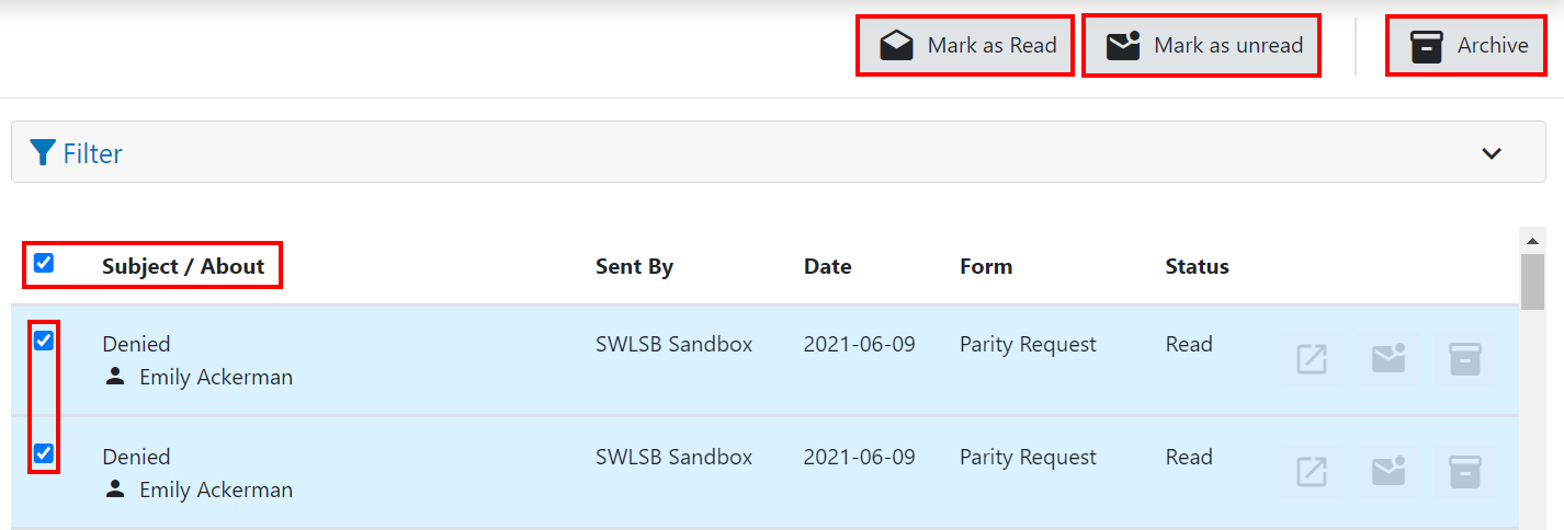 You can bulk flag notifications as read, unread, or archived by selecting the checkboxes beside each notification and selecting the action you’d like to apply. Select the checkbox beside the Subject / About heading to select all.