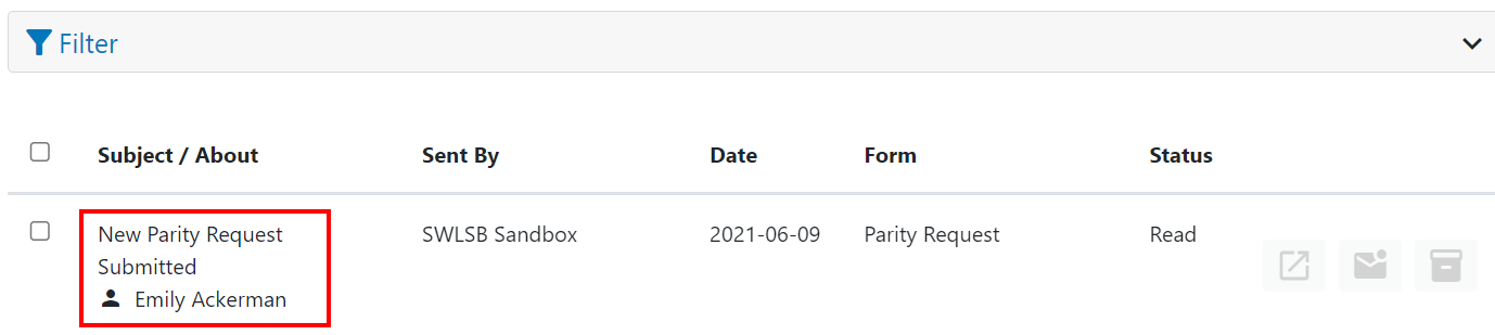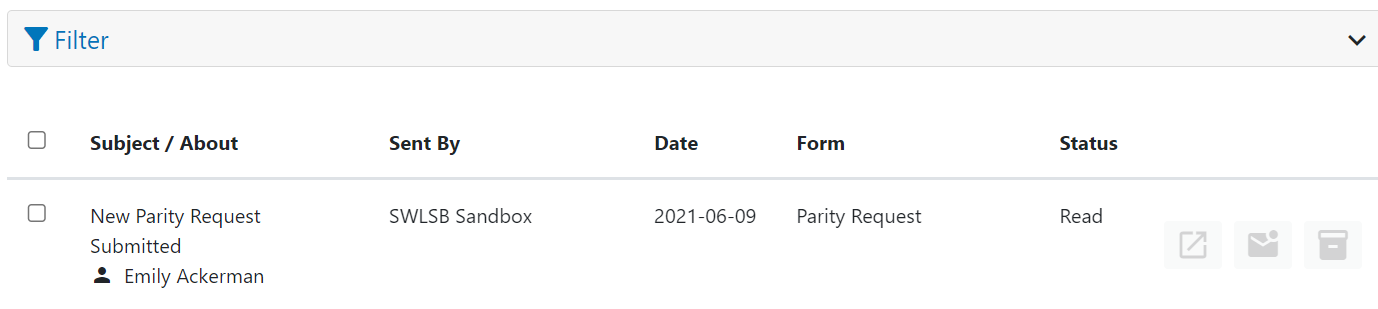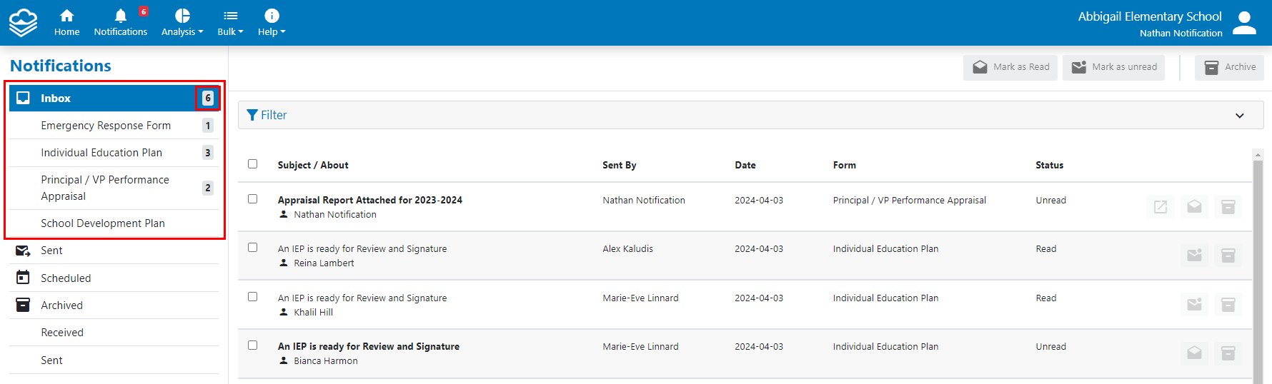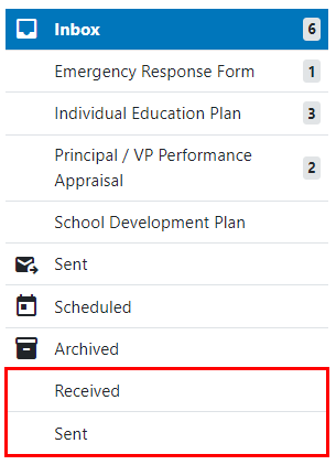 Users can choose to either view all notifications they have received, or select a specific form to view the notifications for. The numbers beside the form name or Inbox selected indicate the total number of unread notifications for that form or the Inbox.