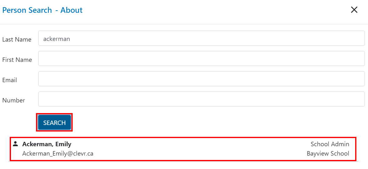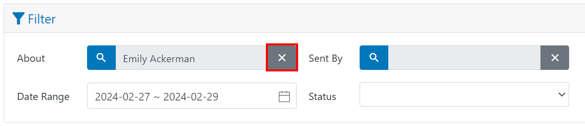 About is the person the notification you received is about, sent by is the name of the person who sent you the notification. Clicking the About filter will display a pop up where you can enter the person’s first name / last name / email / ID number.