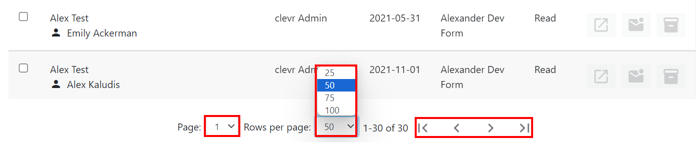 The notification board will default to showing you the 50 most recent notifications. If you need to navigate to view older notifications, you can choose to display up to 100, select the page you wish to view in the page number dropdown, or move to the next page by clicking on the arrows.