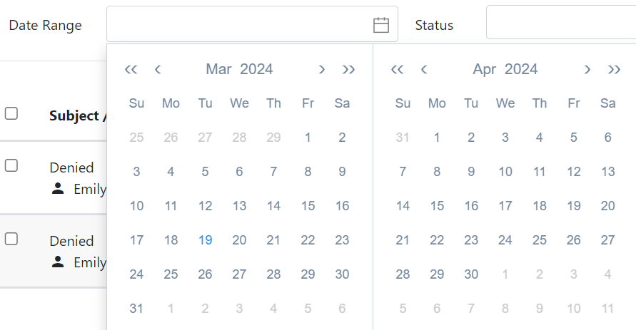You can apply a date range filter to locate notifications received during a certain time period. Clicking the date range filter will display a pop up calendar where you can select a begin date and an end date for your date range.