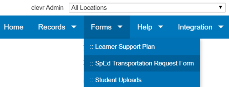 While you are within a student’s record, you can see which other forms a student has a record for by clicking on the Forms menu button. Select a form from this dropdown to be taken to that record.