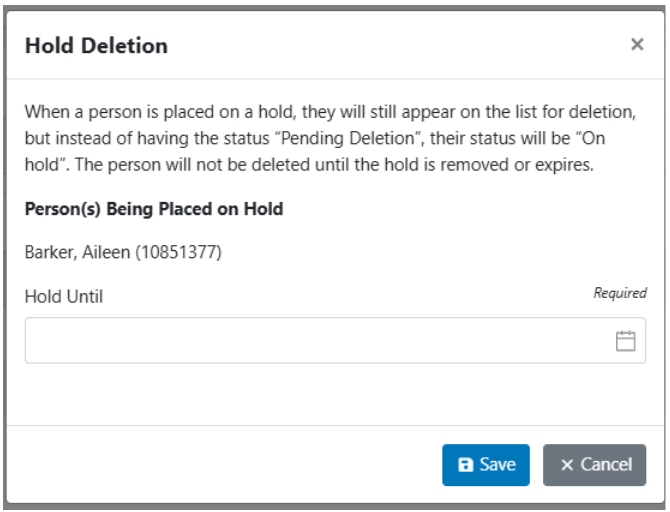 Once the individual/individuals are selected for holds, a modal pops up where it lists who is being held and allows you to put an expiry date to the hold.