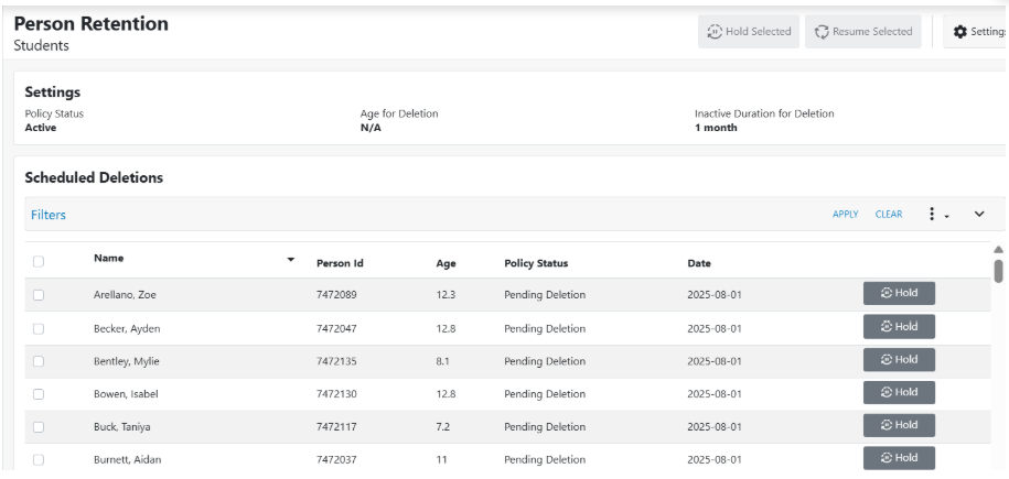 Configuring Retention Policies The Person Retention area is where you will define the rules for automatically deleting student and staff data. To Set a Student Retention Policy From the main menu, navigate to the Person Retention section and click ...