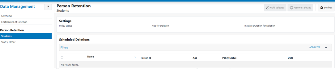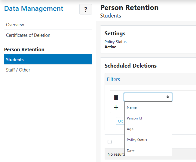 The Person Retention area is where you will define the rules for automatically deleting student and staff data.