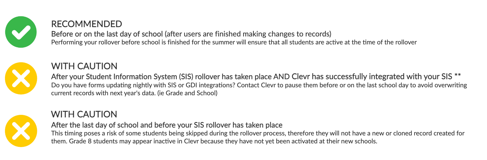 The timing of your record rollover is a key indicator of success in preparing your records for the new school year. Please refer to the 3 options below to ensure your records are prepared as expected for the new school year.